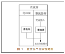 2直流屏作業(yè)原理圖1為直流屏作業(yè)原理簡圖。在圖1中,蓄電池和整流器組成了變電站的直流屏,當(dāng)有交流輸入電源時(shí),整流器作業(yè),把交流電整流成直流電,與蓄電池一起協(xié)作,供應(yīng)直流負(fù)荷安穩(wěn)的直流電源。