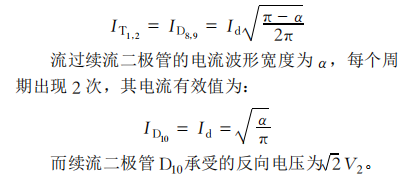 加了續(xù)流二極管后其輸出電壓波形V3與不加續(xù)流二極管時(shí)相同。原先流經(jīng)橋臂上元件的續(xù)流電流變成通過(guò)二極管續(xù)流。各原件中流過(guò)的電流波形和變壓器副邊電流波形明顯有一定的間隔。每個(gè)周期中流過(guò)晶閘管T1、T2、D8D9的電流波形寬度都是π—α,其電流有效值為(Id為負(fù)載電流)