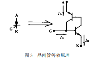 晶閘管的結(jié)構(gòu)相當(dāng)于串級(jí)雙晶體管模型PNPN4層結(jié)構(gòu),因而具有3個(gè)PN結(jié),分別引出陽(yáng)極A,陰極K,門(mén)極G。在圖3結(jié)構(gòu)里無(wú)論在PNPNPN晶體管的AK端點(diǎn)施加正向電壓還是反向電壓,其中的PNPN結(jié)構(gòu)都處于高阻阻斷狀態(tài),只通過(guò)很小正向漏電流或很小的反向漏電流,與一般二極管的反向特性相似。一旦門(mén)極電流Ic注入G點(diǎn),就會(huì)由于形成強(qiáng)烈的正反饋導(dǎo)致PNPNPN進(jìn)入完全飽和狀態(tài),即晶閘管飽和導(dǎo)通。