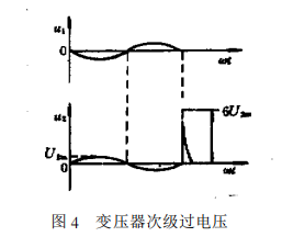 另一方面,直流屏變壓器交流側(cè)也會(huì)由于大容量負(fù)載如大變比變壓器的合閘瞬間、其它負(fù)載切斷電源時(shí)以及整流變壓器電刀閘的開(kāi)關(guān)斷開(kāi),也會(huì)由于初次級(jí)繞組間的分布電容,變壓器的激勵(lì)電流的突變?cè)诖渭?jí)產(chǎn)生瞬時(shí)過(guò)電壓,其尖峰值可達(dá)工作電壓峰值的6倍以上,如圖4所示。