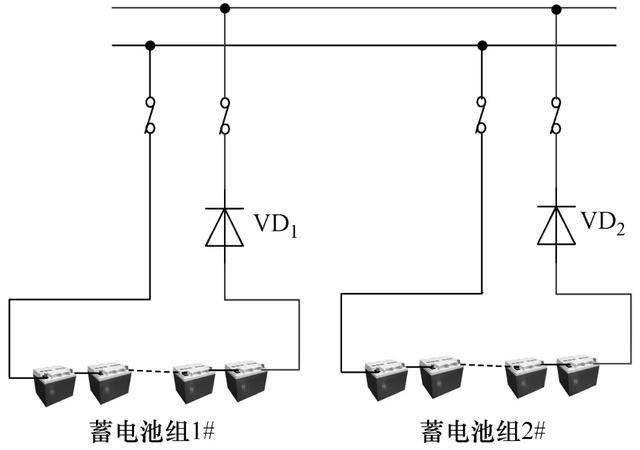 在外部交流供電異常時,蓄電池組由連接在直流屏正極與蓄電池組正極之間的大功率二極管VD1/VD2無縫對負載進行供電。放電通道并聯(lián)等效電路如圖4所示。在電池組并聯(lián)時,即便兩組電池存在電壓差,高電壓蓄電池組與低電壓蓄電池組之間也不導通,不存在充電回路,故避免了環(huán)流現(xiàn)象的產(chǎn)生。