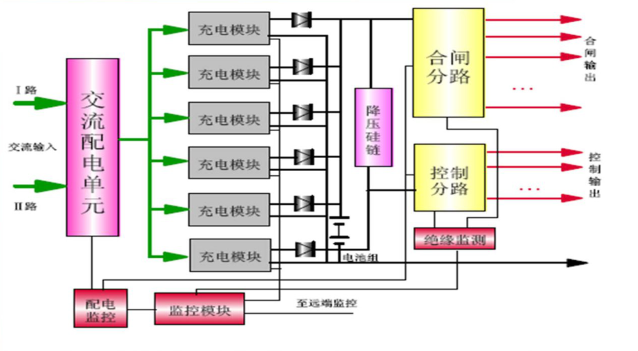 直流電源系統(tǒng)的主要功能單元包括交流配電單元、充電裝置、蓄電池組、降壓裝置、直流饋電單元以及監(jiān)控單元等。