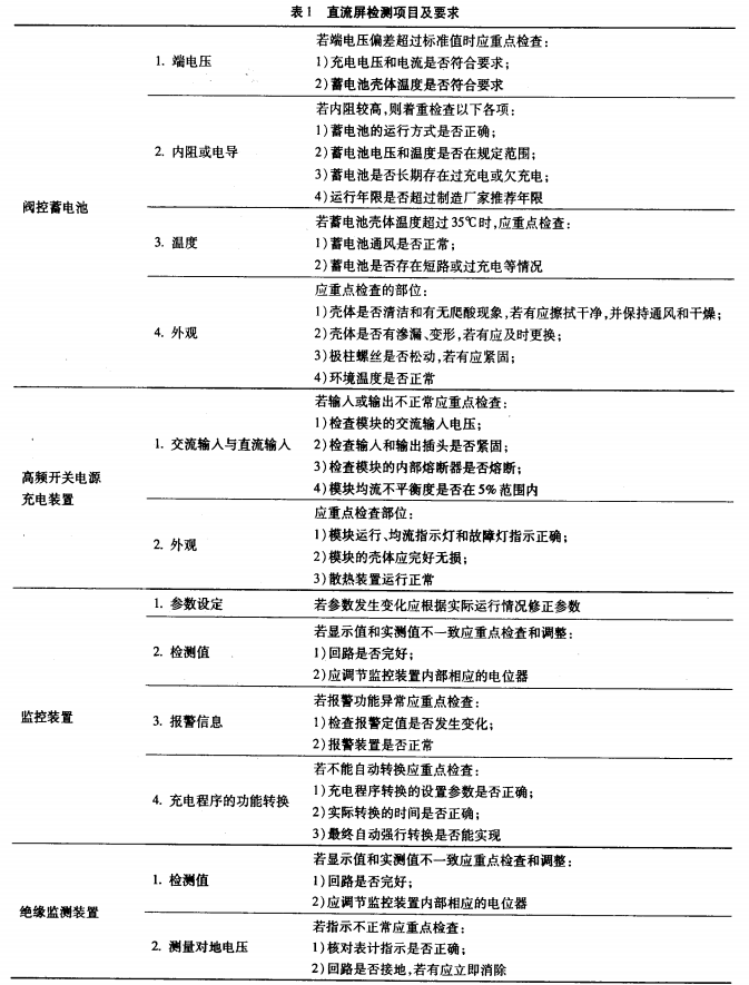 在建立完善的點檢準則之前,首要有必要制定契合現(xiàn)場要求,并可以作為依據(jù)的設備檢修規(guī)范。在直流屏規(guī)范中規(guī)矩了直流電源系統(tǒng)設備檢修的基本要求,檢修前的預備、檢測項目、充放電試驗等內(nèi)容。直流屏主要由蓄電池.高頻開關電源充電設備,監(jiān)控設備、絕緣監(jiān)測設備4部分組成,見表1。