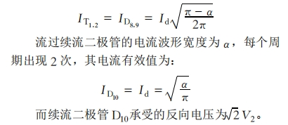 加了續(xù)流二極管后其輸出電壓波形V3與不加續(xù)流二極管時相同。原先流經(jīng)橋臂上元件的續(xù)流電流變成經(jīng)過二極管續(xù)流。各原件中流過的電流波形和變壓器副邊電流波形顯著有必定的間隔。每個周期中流過晶閘管T1T2、D8、D9的電流波形寬度都是π—α,其電流有效值為(Id為負載電流)