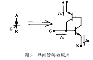 晶閘管的結(jié)構(gòu)相當于串級雙晶體管模型PNPN4層結(jié)構(gòu),因而具有3PN結(jié),別離引出陽極A,陰極K,門極G。在圖3結(jié)構(gòu)里不管在PNPNPN晶體管的AK端點施加正向電壓仍是反向電壓,其中的PNPN結(jié)構(gòu)都處于高阻阻斷狀況,只經(jīng)過很小正向漏電流或很小的反向漏電流,與一般二極管的反向特性類似。一旦門極電流Ic注入G點,就會因為形成激烈的正反饋導致PNPNPN進入完全飽滿狀況,即晶閘管飽滿導通。