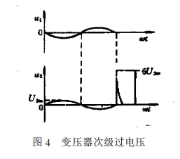 另一方面,直流屏變壓器溝通側(cè)也會因為大容量負載如大變比變壓器的合閘瞬間、其它負載堵截電源時以及整流變壓器電刀閘的開關(guān)斷開,也會因為初次級繞組間的分布電容,變壓器的鼓勵電流的驟變在次級發(fā)生瞬時過電壓,其尖峰值可達作業(yè)電壓峰值的6倍以上,如圖4所示。