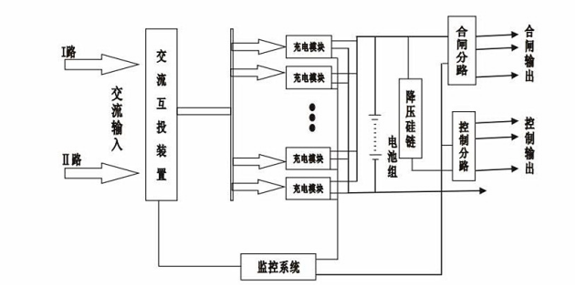 直流屏工作進(jìn)程簡化為充放電的循環(huán)。當(dāng)蓄電池電量足夠時處于浮充情況,由充電模塊向開關(guān)柜控制母線體系跟合閘母線體系等設(shè)備供應(yīng)小電流。若發(fā)生斷電現(xiàn)象,關(guān)閉充電模塊,由蓄電池向負(fù)載供應(yīng)電能,保證斷電后,高壓開關(guān)柜等設(shè)備仍可正常工作一段時間,為缺點(diǎn)打掃爭奪最大的時間差,防止呈現(xiàn)傳達(dá)信號間斷的情況。當(dāng)電路恢復(fù)正常充電模塊則重新啟動,向母線體系等設(shè)備繼續(xù)供應(yīng)小電流,并對蓄電池充電,布滿后切換成浮充情況。
