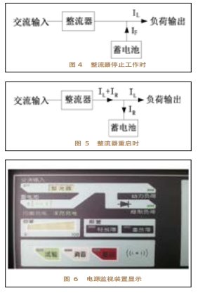 4)當(dāng)從停電狀況到電源康復(fù)供電時(shí),整流器再次發(fā)起,此刻整流器既要向負(fù)荷輸出供電,一起還要向蓄電池充電,補(bǔ)償蓄電池消耗的電能,直至蓄電池充電結(jié)束。如圖5所示。