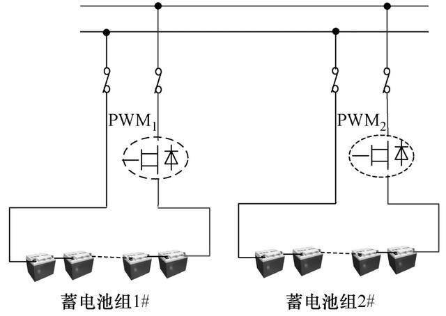 在并聯(lián)保護(hù)器中的直流屏與蓄電池組之間接入IGBT(insulated gate bipolar transistor),通過(guò)PWM電路控制充電電壓和充電電流大小,對(duì)充電電流進(jìn)行限制。兩組蓄電池通過(guò)并聯(lián)保護(hù)器并聯(lián)連接時(shí),其充電通道并聯(lián)等效電路如圖3所示。